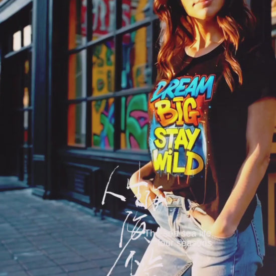 Let your outfit speak louder than words with this bold graphic tee. The “DREAM BIG STAY WILD” message pops in vibrant graffiti-style lettering — perfect for those who live out loud and chase big dreams.