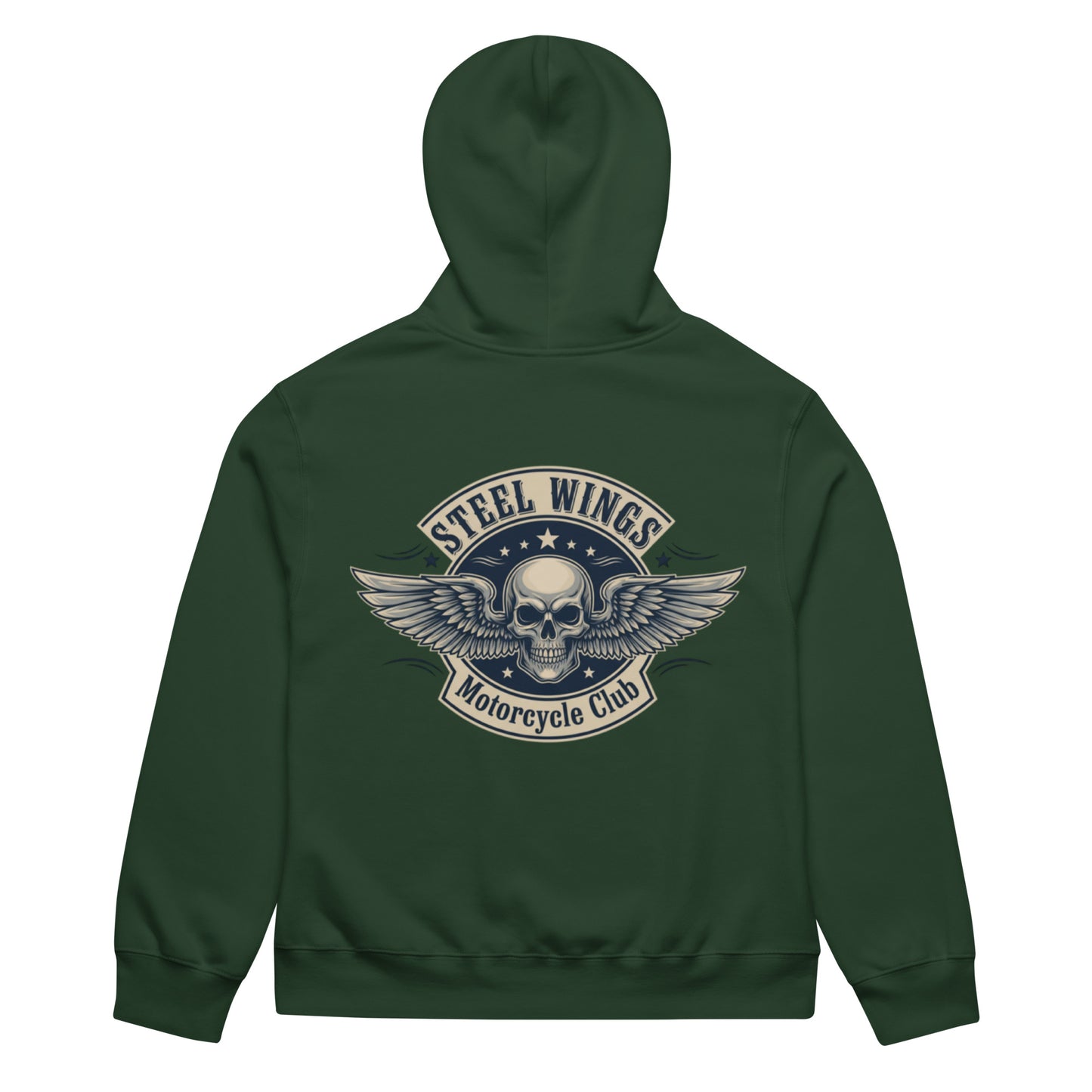 Make a statement with the Buyaro™ Oversized Heavyweight Hoodie – Steel Wings Skull Biker Design.