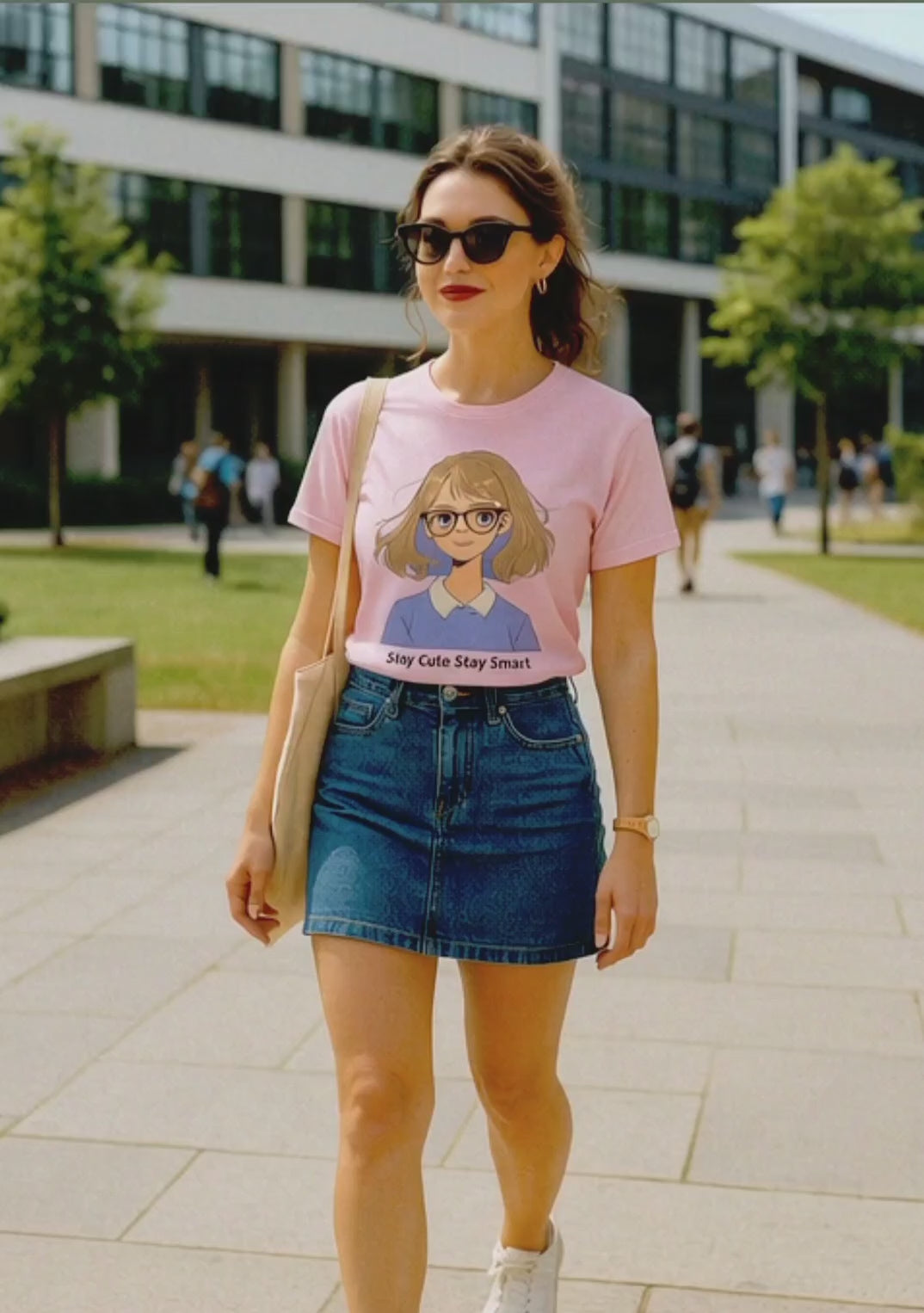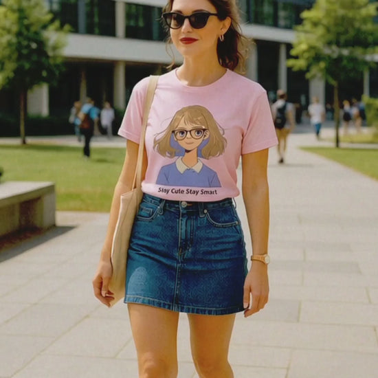 This adorable tee features a cute anime-style girl with glasses and a confident smile, paired with the empowering quote: "Stay Cute, Stay Smart."