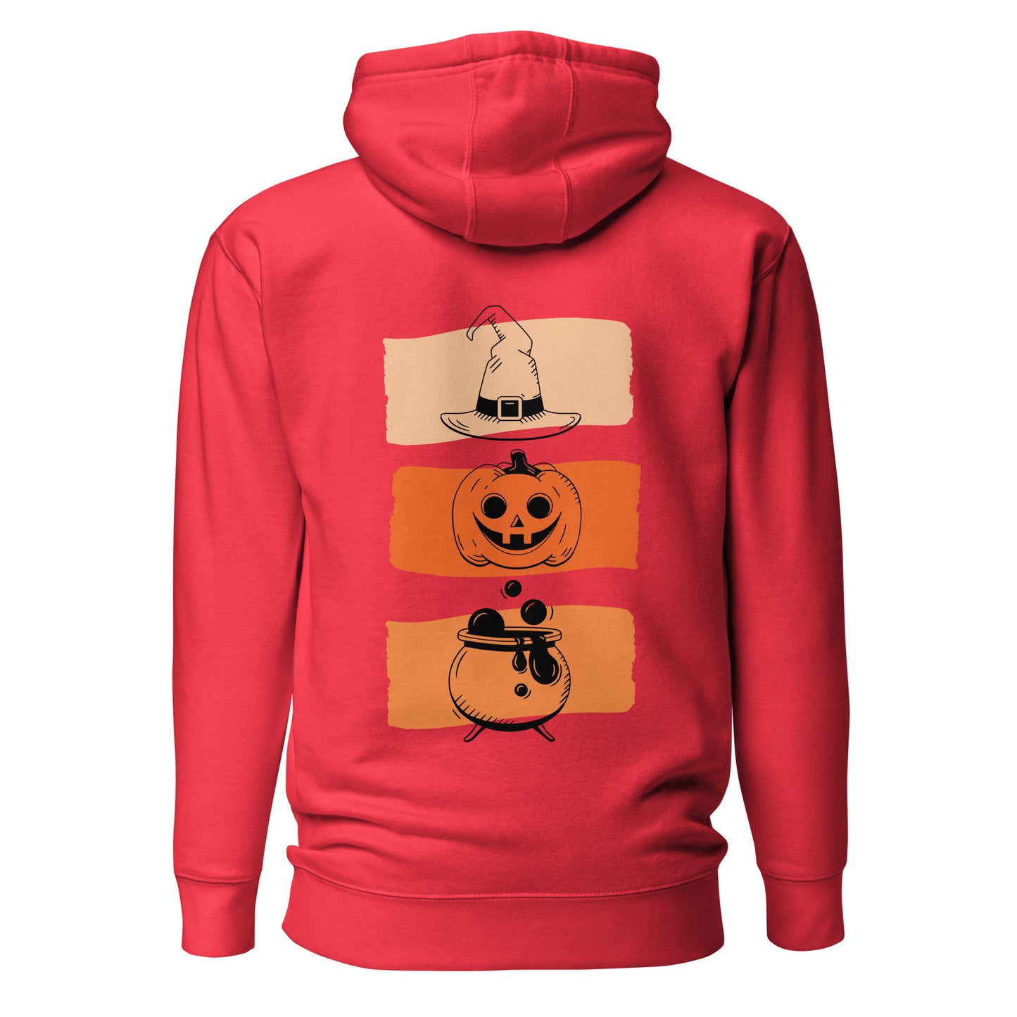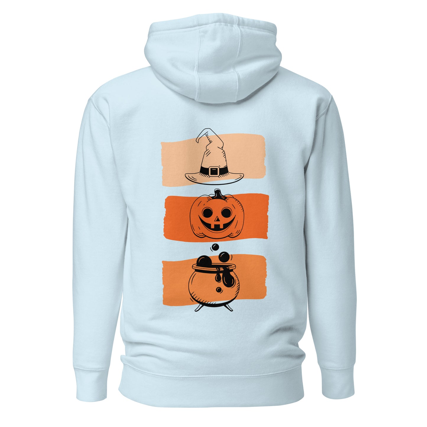 This premium black hoodie combines playful Halloween vibes with comfort, featuring a cheerful ghost holding pumpkin spice on the front and spooky hat–pumpkin–cauldron graphics on the back.